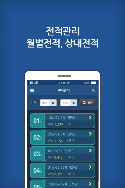 게임 설정 : 선수 등록, 수정, 삭제 / 게임 결과 리스트 / 통계보기 / 그래프 보기